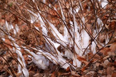 ここ数日の冷え込みで、今年もようやくシモバシラを見ることができました。このシモバシラはコナラやクヌギなどの雑木林の縁で、しかも陽射しに照らされていたためにだいぶ溶けてしまったものの、冷え込みが強かったためにギリギリ撮影できたものです。この林には別の場所にも数カ所シモバシラを見ることができますものの、この場所が一番撮影には向いていると毎年繰り返し撮影しているだけに、今か今かと指折り数えながら待ち続けて・・・