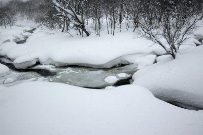 ヨッピ橋の下流で沼尻川と合流して名が只見川となり、平滑ノ滝、三条ノ滝と下りやがて阿賀野川として日本海に注いでいます。写真は東電小屋の東辺りでの撮影ですが、そこそこの積雪があるのが分かると思います。(2月27日を参照して下さい)この下流にかかる東電尾瀬ケ原橋もかつては除雪をしていましたが、新しくなってからは除雪をしなくて済むようになり、その分除雪隊の負担も軽減されました。有数の豪雪地帯のはずの尾瀬は・・・