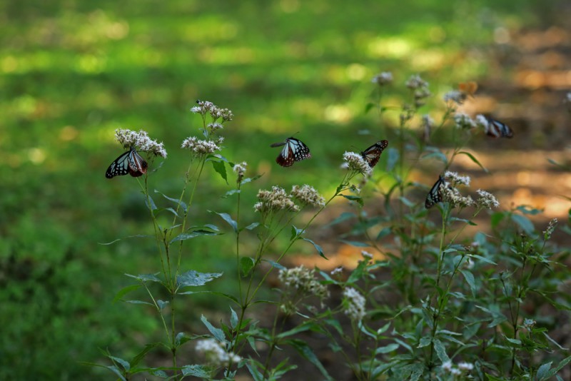 炎天下に畑の中の道での散歩は危険と考えて、赤城自然園の森の中を歩いて見ましたら、コナラ、クヌギ、ブナなどの葉が直射日光を遮ってくれるだけではなく、野鳥の囀りが心地良いBGM効果を演出したり、時折樹冠を風が吹き抜けてくれて実に爽快でした。それから、数こそ少ないもののアサギマダラを数頭見かけたり、花から花へと蜜を求めるジャコウアゲハの姿も・・・