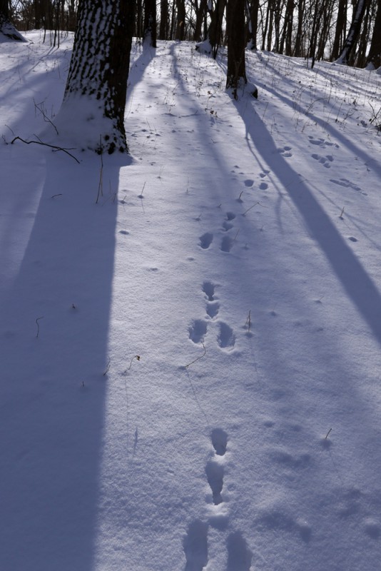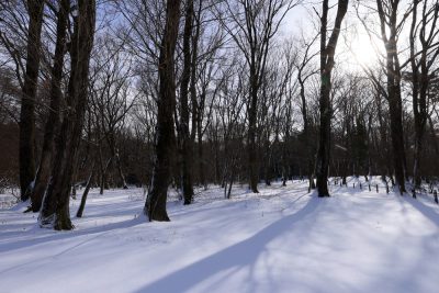 乾燥していたから、少しまとまった降雪でお湿りが欲しいとこと思っていましたのに、なかなか期待通りには降ってくれませんでした。その反発でしょうか気温が下がり風も冷たくて、森の中でも露出している肌は痛いくらいでした。そんな降り方をした雪ですから樹々には止まらず、落葉の上を白く染める程度でした。仕方なしにいつものコースを歩きながら、普段の鳥モードを風景モードに切り換えて数カット撮影しましたが、やはり不完全燃焼に・・・